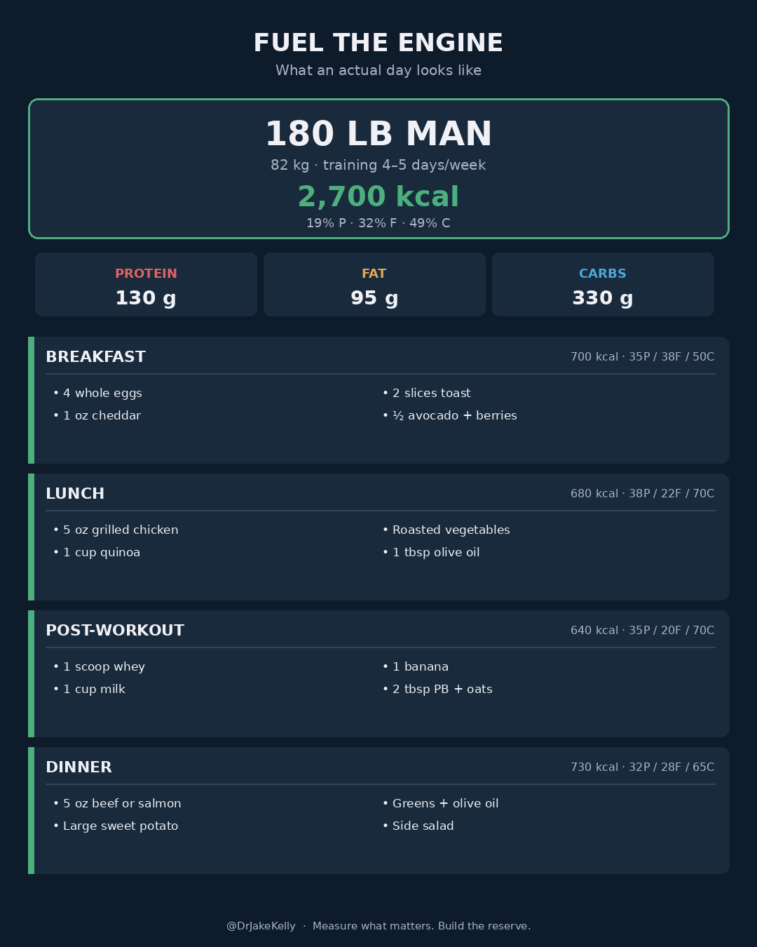 Neither of these daily nutrition intake strategies are complex. They don’t require a tracking app. The point is that hitting the target macronutrient distribution becomes routine (and relatively easy) once you see what a meal is supposed to look like.