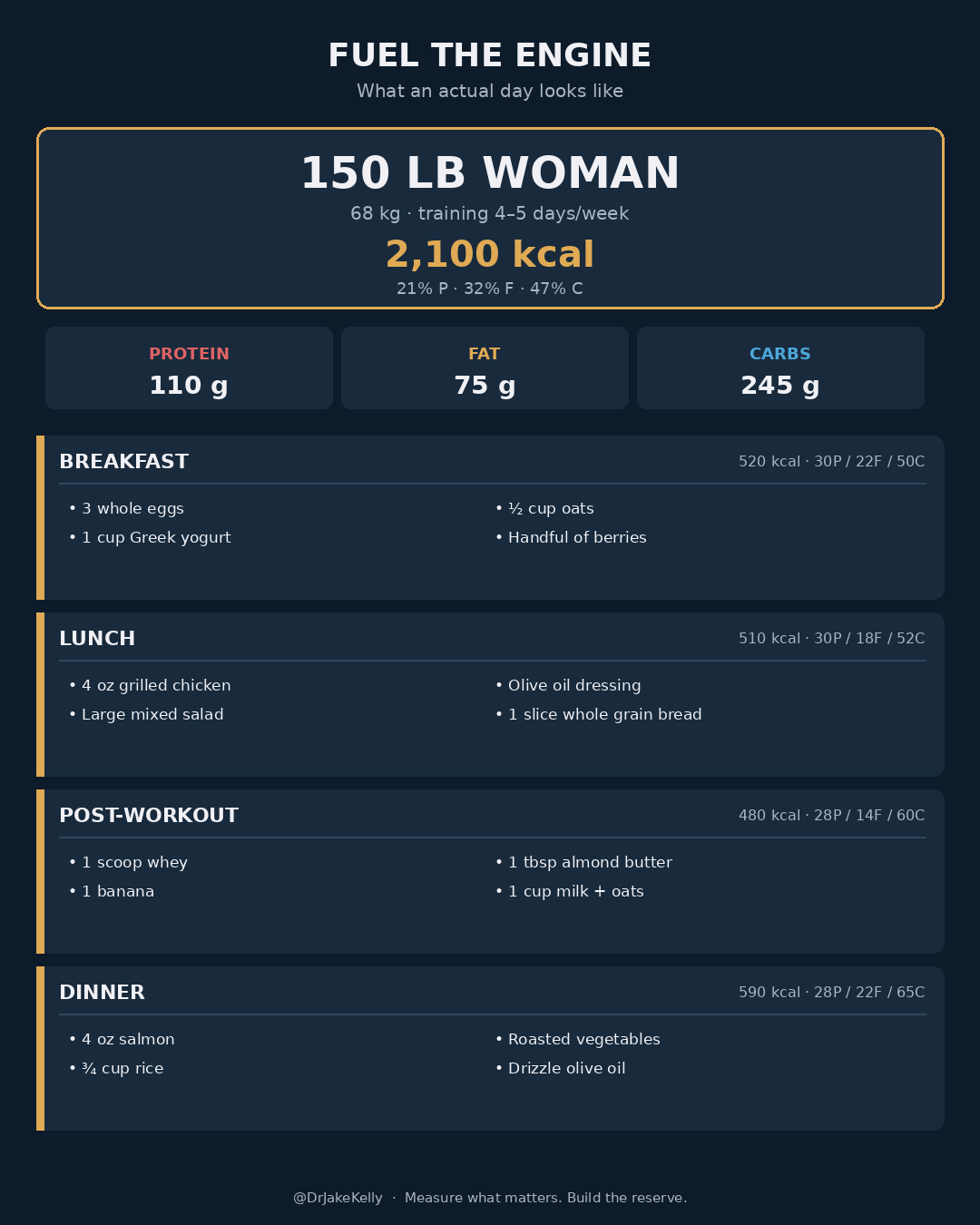 A 150 lb (68 kg) woman training for cardiorespiratory fitness is roughly 110 g of protein per day, or about 27 g per meal across four meals. Three eggs and a cup of Greek yogurt at breakfast. A palm of grilled chicken (4 oz) on a salad at lunch. A scoop of whey in a recovery smoothie after training. A 4 oz piece of salmon at dinner.