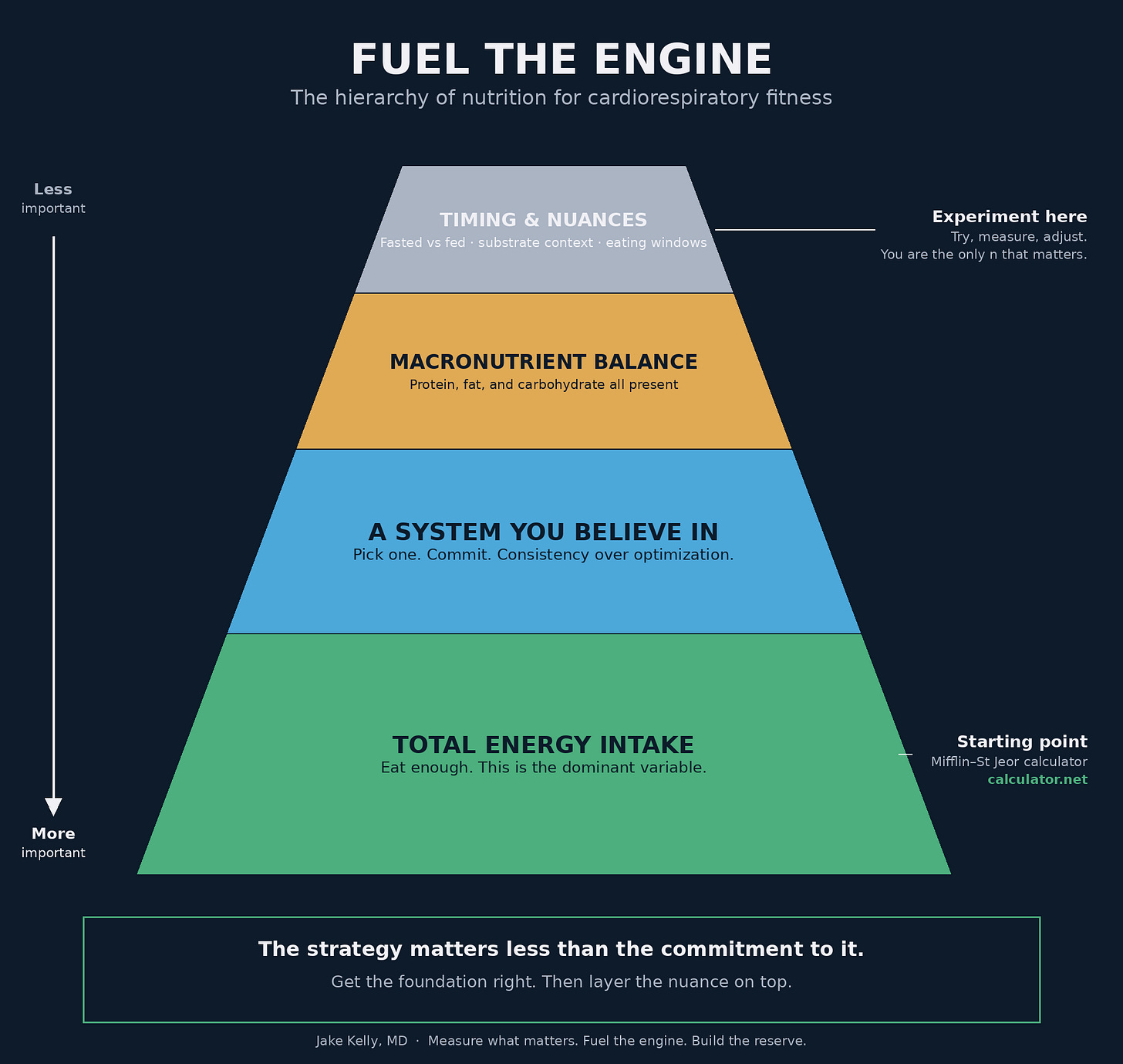 Third: the nuances. Timing. Fasted vs fed. Substrate context. Eating windows. These can be important. They should be layered on top of a foundation that has to be solid first. This is also the layer where you get to experiment. Try a fueled long run for a month and see how recovery feels. Try a 12-hour eating window and watch your fasting glucose. Move dinner earlier. Add a pre-workout banana. You are the only n that matters here. Nuance is where you find your version.