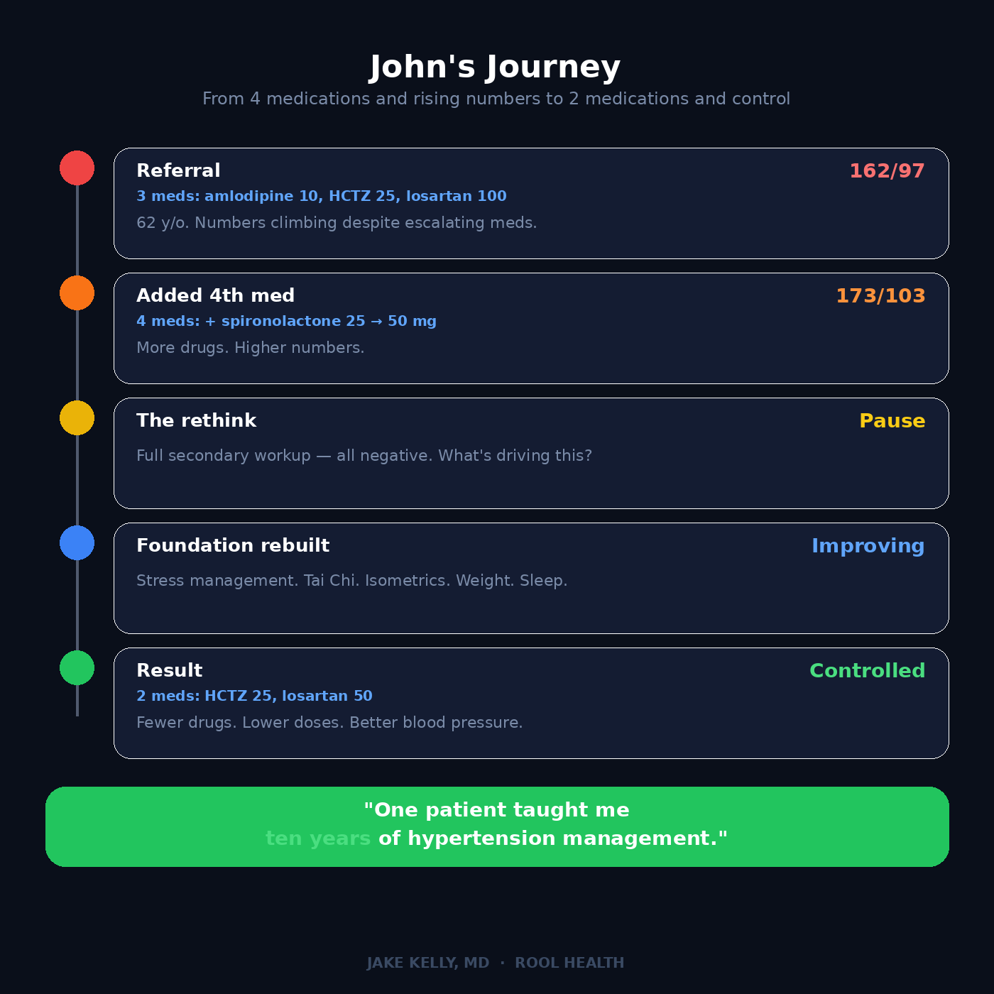 I’ll come back to John. But his clinical response suggested I was planting weeds in his garden. I was focused on reducing a number without treating the person. More medications was not the answer. Understanding what was actually driving up his pressure was the needed solution.