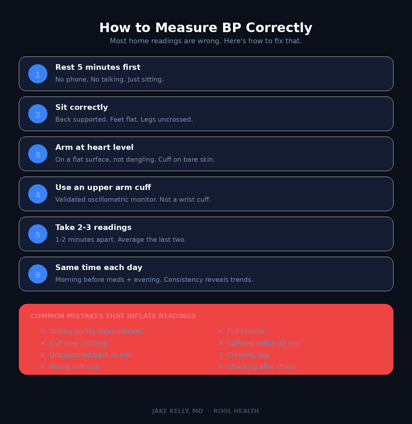Sit quietly for five minutes before measuring. Don’t scroll on your phone. Do not talk. Sit still. Keep your feet flat on the floor. Support your back. Rest your arm at heart level on a flat surface. Do not dangle your arm at your side. Place the cuff on bare skin, not over clothing.