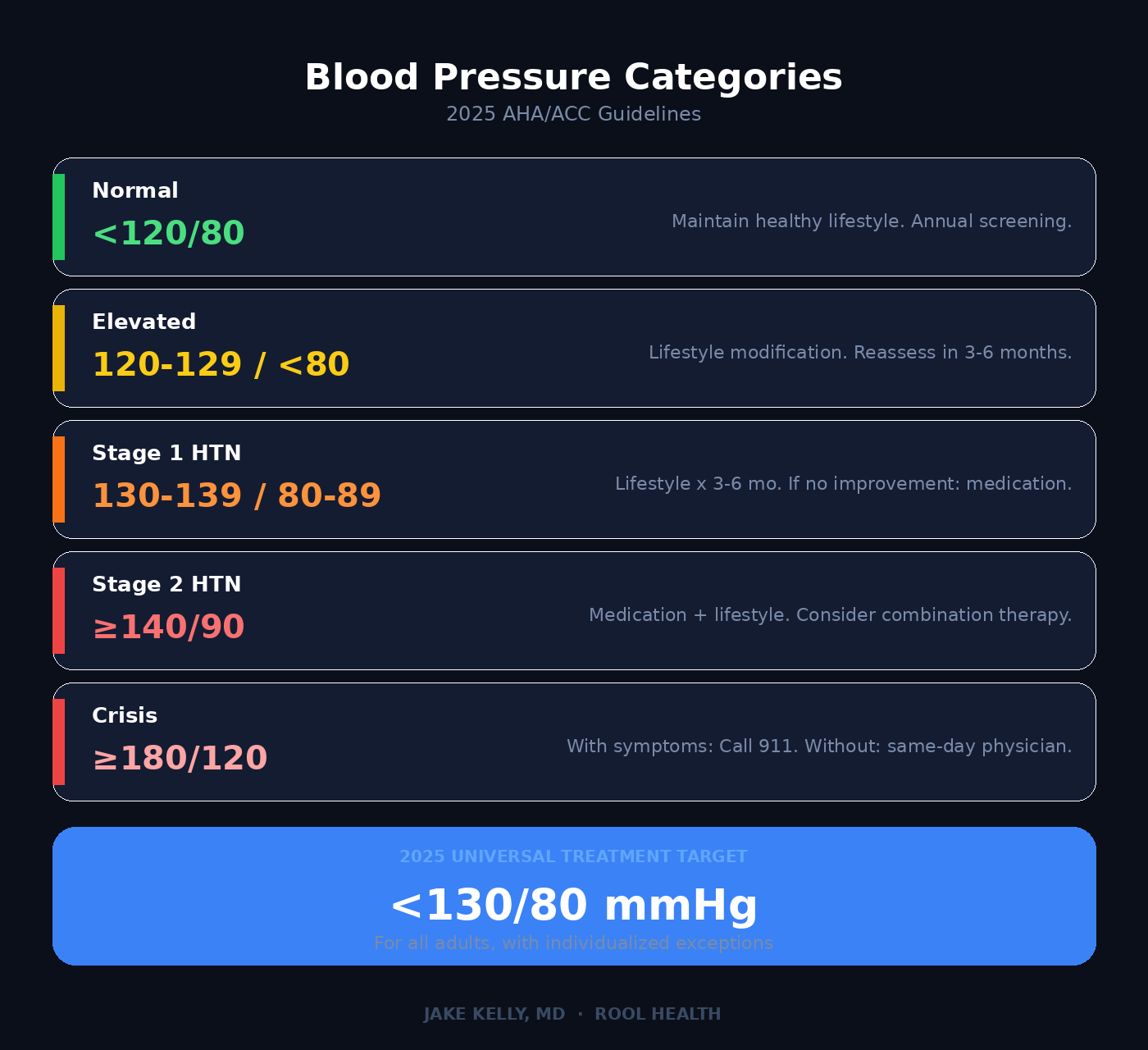 The 2025 guidelines recommend that low-risk adults with stage 1 hypertension (130–139/80–89) who don’t improve after three to six months of lifestyle modification should start medication: targeting below 130/80. Previously, these patients were told to “watch and wait.”