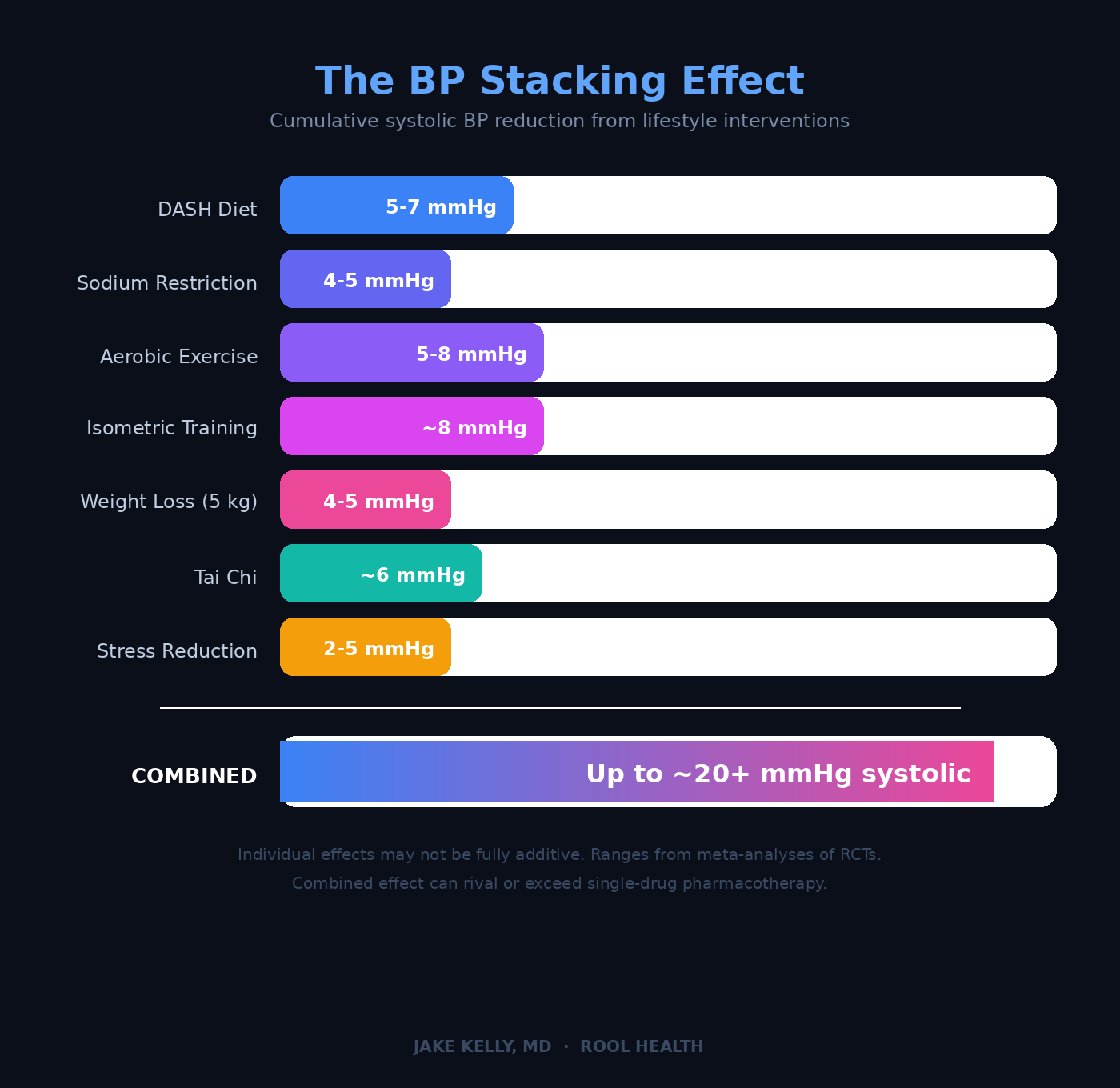 No single lifestyle change matches the efficacy of combination pharmacotherapy. Stack them together: DASH diet with sodium restriction, regular aerobic exercise, isometric training, weight loss and stress management. Now you’re looking at cumulative reductions that can approach 20 mmHg systolic or more.