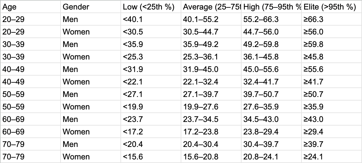 VO₂ Max Reference Ranges (FRIEND Registry, mL·kg⁻¹·min⁻¹)