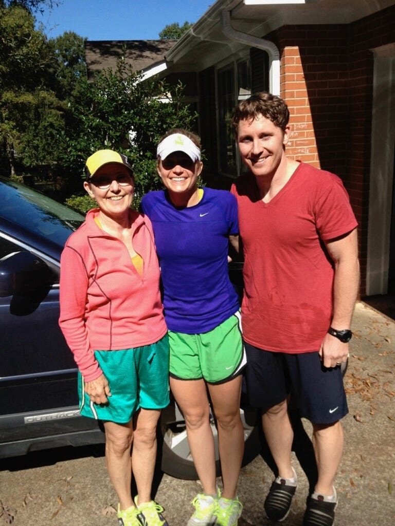Linda (mom, age 68 at time of photo), Katie, Jake in 2013 after a running race in Durham, NC.
