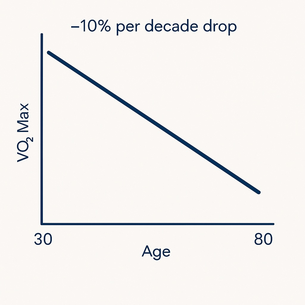 Peak VO₂ max declines ~10% per decade after age 30.